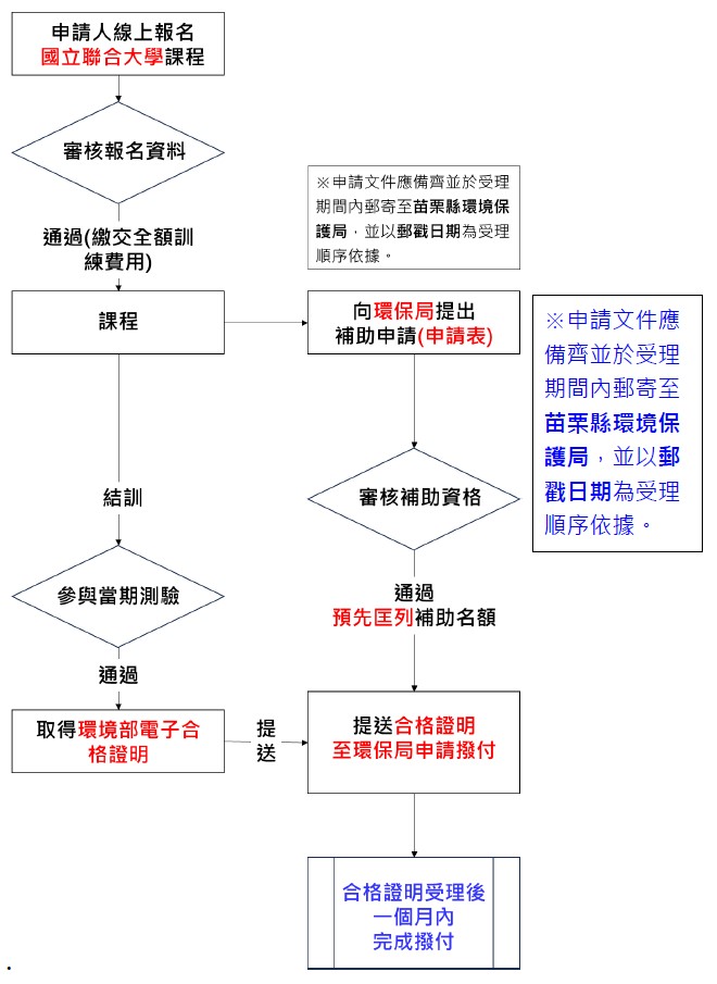 (二)申請人需線上報名國立聯合大學所開設之「環境部淨零綠領人才培育課程」[報名請至環境部綠領人才資訊平臺 (https://reurl.cc/X2WaG3) 查詢苗栗縣],依通知完成學費繳納,取得參訓資格,並於結訓後,參加當期由國家環境研究院統一辦理之測驗,並取得測驗合格證明者,得申請學費補助3,000元(申請表如附件一,需同時檢附受訓通知及測驗合格證明)。